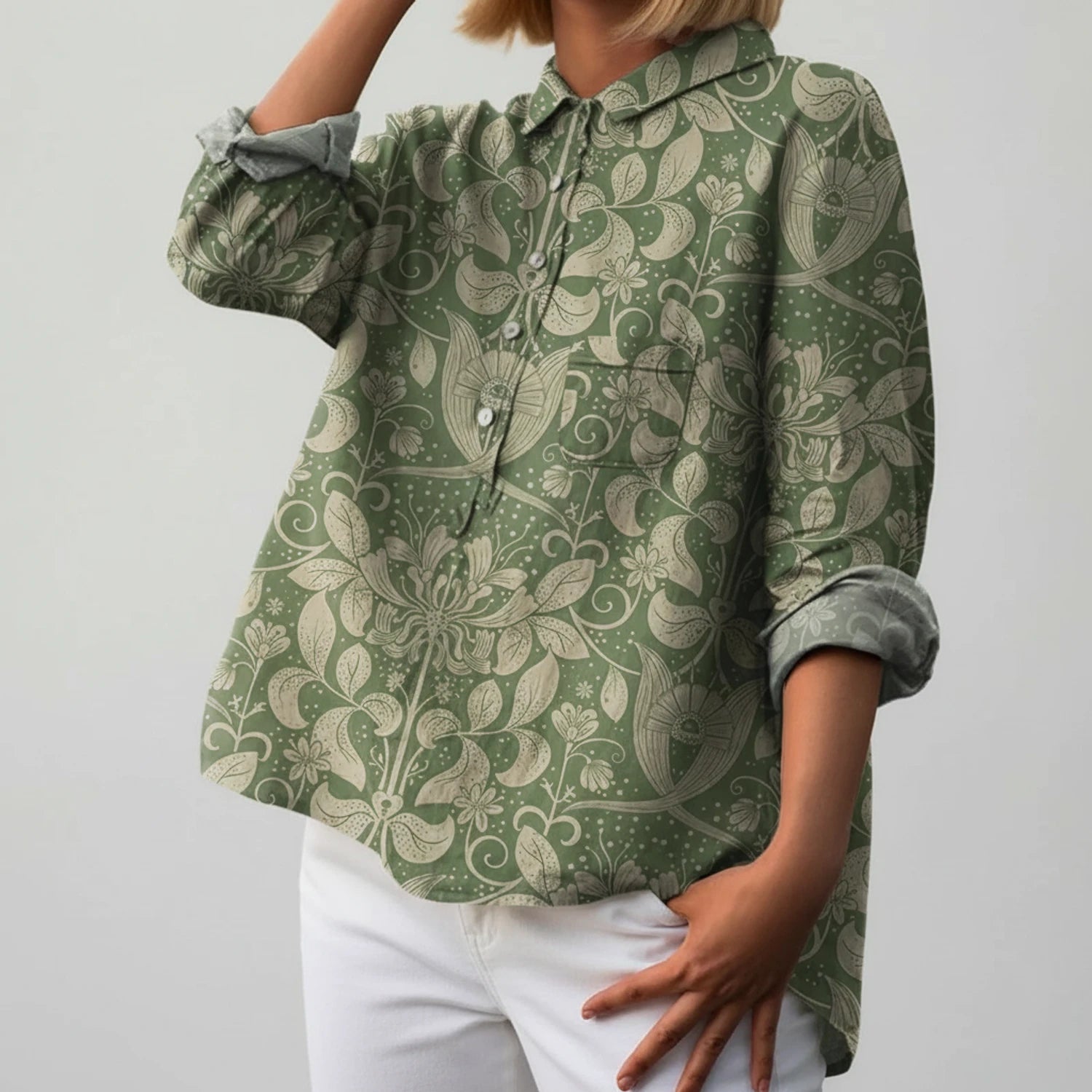 Elevate your everyday wardrobe with this charming floral print blouse. The relaxed fit and high-low hem offer a modern and comfortable silhouette, perfect for both casual and semi-formal occasions. With its button-down design and chest pocket, this blouse combines practicality with a touch of feminine flair, setting it apart from ordinary shirts.