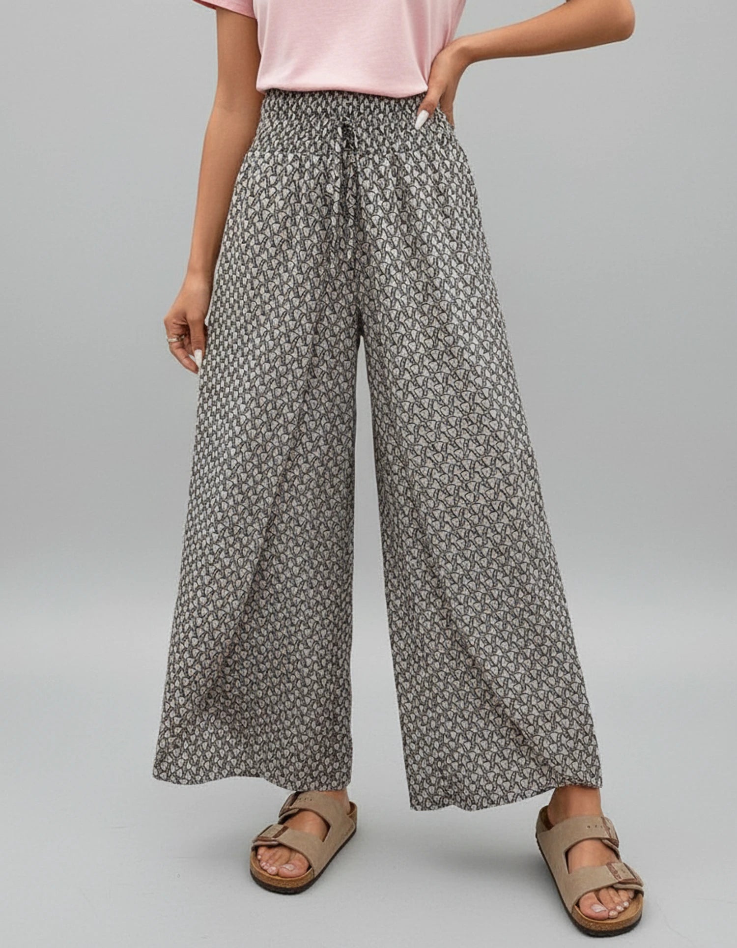 Step into sophisticated style with these wide leg pants. Designed with a flattering high waist and comfortable elastic drawstring, these pants are perfect for creating a chic and relaxed look. The flowing silhouette and unique print make them a versatile addition to your wardrobe, suitable for both casual and more dressed-up occasions.