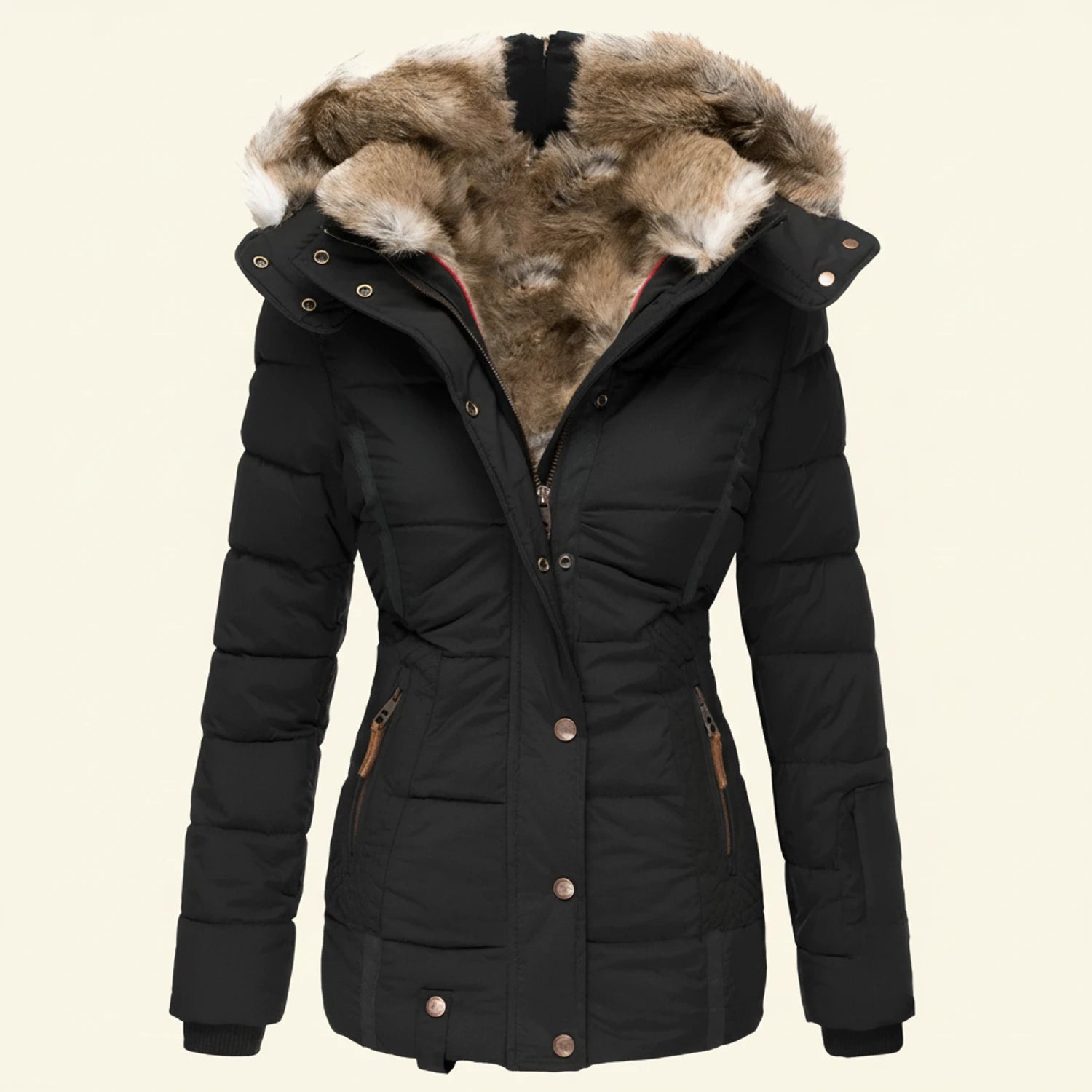 This hooded puffer jacket combines warmth and style for the modern woman. Featuring a quilted design and a cozy hood with faux fur trim, it's perfect for braving the cold in comfort and fashion. The fitted silhouette adds a touch of elegance, making it a versatile addition to your winter wardrobe.