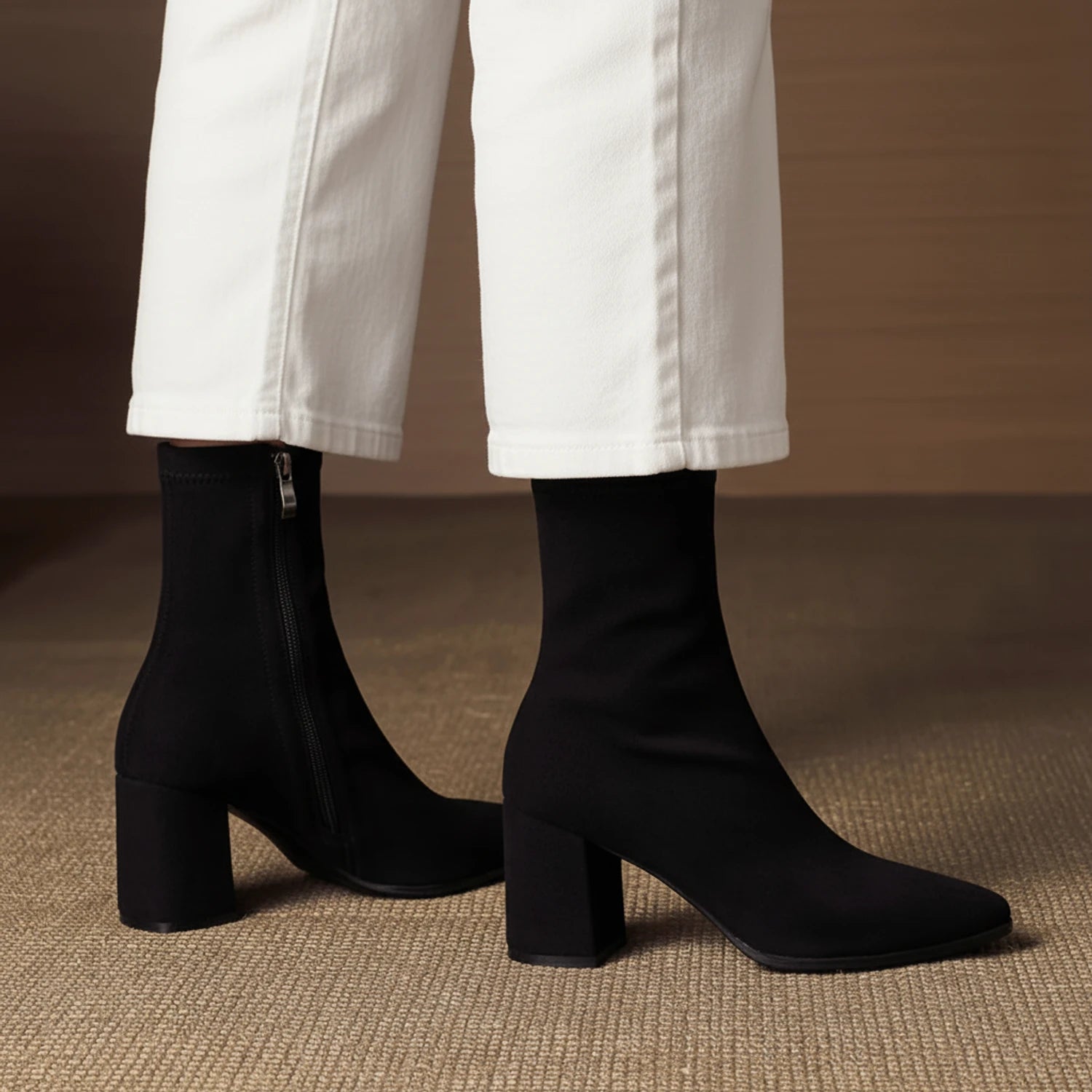 Step out in style with these chic pointed toe ankle boots. Featuring a modern sock boot design and a comfortable block heel, these boots are perfect for adding a touch of sophistication to any outfit. The convenient zipper closure ensures easy wear, making them a versatile addition to your wardrobe.