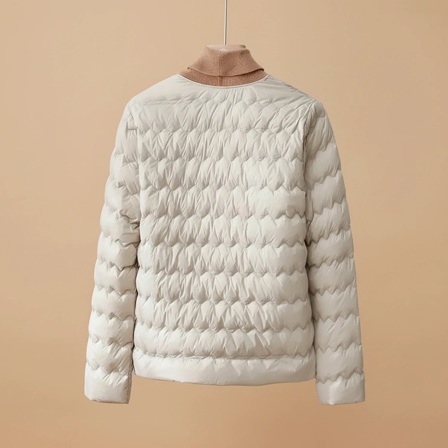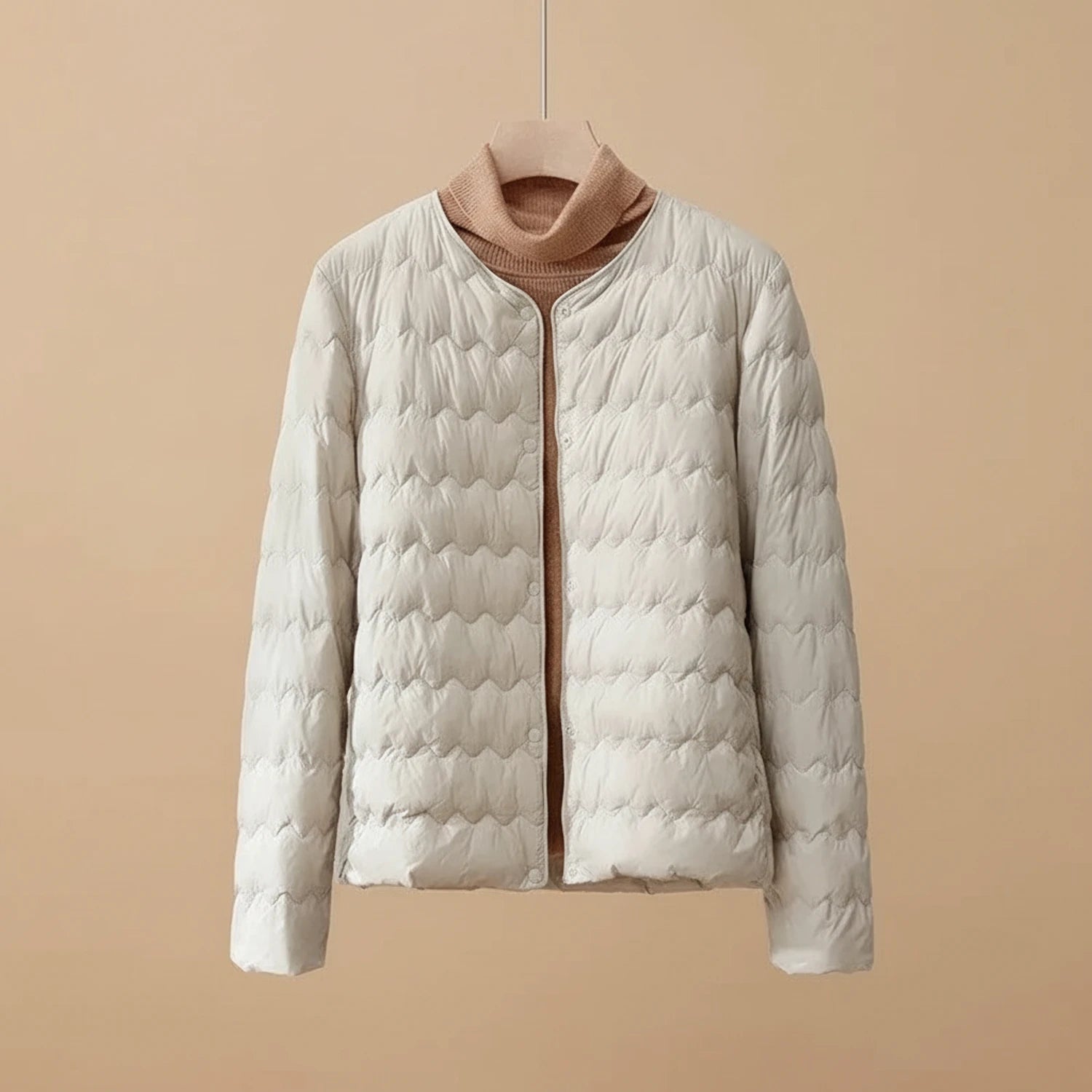 This lightweight quilted jacket offers the perfect blend of comfort and style. Its collarless design provides a modern, minimalist look, while the quilted pattern adds a touch of texture and sophistication. Perfect for layering or wearing on its own, this jacket is a versatile addition to any wardrobe.