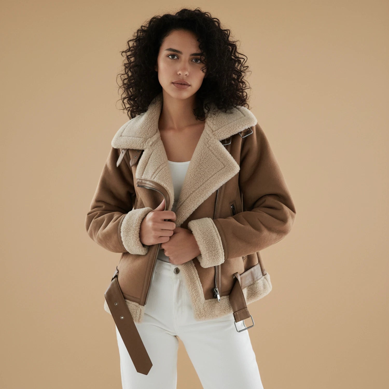 This women's aviator jacket blends classic design with modern details, featuring a plush shearling and an asymmetric zip for a touch of edgy sophistication. The belted waist accentuates the silhouette, making it a versatile piece for any wardrobe. Perfect for adding both warmth and style to your outfit, this jacket stands out with its unique combination of comfort and vintage-inspired charm.